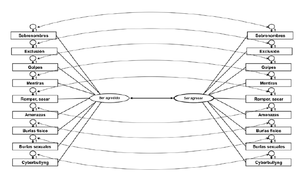 Luego se procedió a llevar a cabo un análisis factorial confirmatorio con la segunda muestra. Para considerar si el modelo era aceptable, se tuvieron en cuenta el Índice Comparativo de Ajuste (CFI), el Tucker-Lewis Index (TLI) y el promedio de los residuales estandarizados al cuadrado (RMSEA). Se puso a prueba un modelo de dos factores relacionados (victimización y agresión) con las correlaciones entre los errores de medición de las preguntas que inquirían conductas similares, como si fueran medidas repetidas (Modelo 1); ya que estudios previos demostraron que los errores de los ítems de ser victimizado y agredir tienden a estar asociados en instrumentos que miden el mismo constructo (Gamez-Guadix et al., 2014). Dicho modelo se presenta en la figura 1.