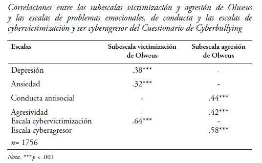 Para explorar la validez convergente de las subescalas victimización y agresión, se realizaron correlaciones de Pearson entre estas y las subescalas cybervictimización y cyberagresión del cuestionario de Calvete et al. (2010). Con el fin de evaluar la validez convergente de la subescala victimización, se realizó una correlación de Pearson entre esta y los puntajes de depresión y ansiedad. El mismo procedimiento se llevó acabo con la subescala de agredir y los puntajes de conducta antisocial y agresividad. En la tabla 3 se presentan los resultados, los cuales mostraban correlaciones significativas y en la dirección esperada. Para la subescala victimización de Olweus, las asociaciones eran rs =.38, .32 y.64 (ps < .001) con depresión, ansiedad y ser cybervictimizado, respectivamente. Para la subescala agresión, eran rs = .44, .42 y .58 (ps < .001) con conducta antisocial, agresividad y ser cyberagresor,