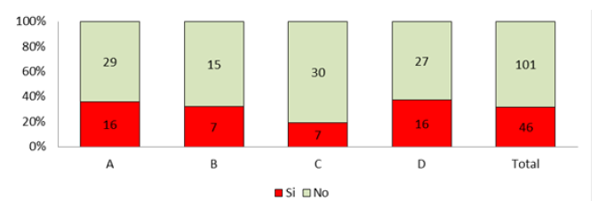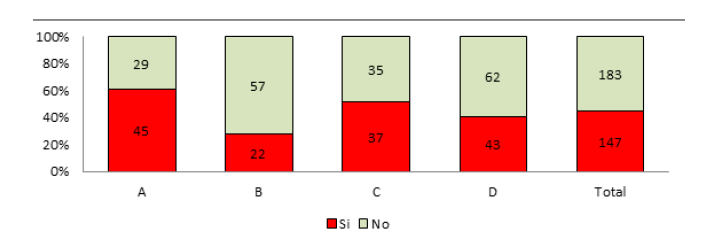 Ante la cuestión planteada a la muestra en la que se preguntaba si conocían la existencia de algún caso de bullying en la secundaria en la que estudiaban en los últimos 12 meses, tal y como se expresa en la figura 1, se observa que, en la Secundaria A, 45 participantes (60.81%) y, en la B, 22 participantes señalan que sí (23.26%), mientras que en la Secundaria C 37 participantes (51.38%) y en la D 43 participantes señalan que sí (40.95%).