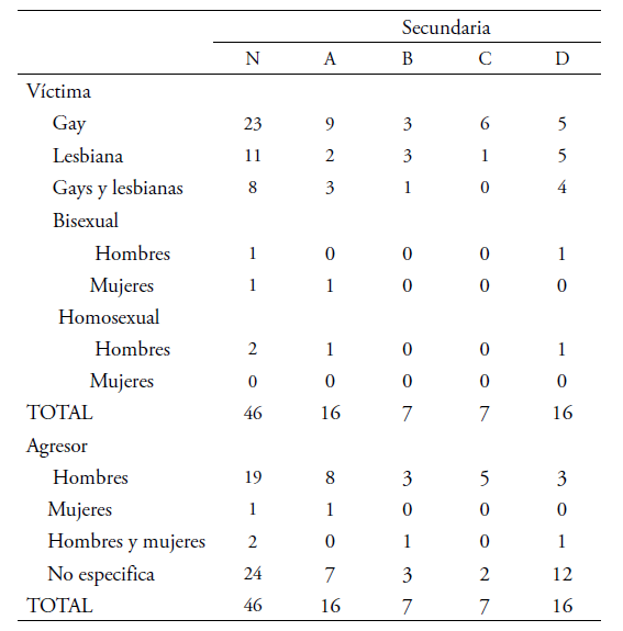 Se identifica que los hombres son el principal perfil tanto de víctimas como de agresores de este tipo de bullying, aunque este aspecto también se ponen de manifiesto en investigaciones precedentes tales como las realizadas por Gualdi et al. (2008), FELGTB y COGAM (2013), Martín-Martín, Molinuevo-Puras, Pichardo-Galán, Rodríguez-Medina y Romero-López (2007), Generelo, Garchitorena, Montero e Hidalgo (2012), Martxueta y Etxeberria (2014), López Amurri (2013) y Gehitu (2012) a nivel internacional, así como otras contextualizadas en México (Lozano, 2009; 2014; Otero, 2016; Granados-Cosme & Delgado-Sánchez, 2008; Ortiz & Granados, 2003; Cáceres et al., 2011).