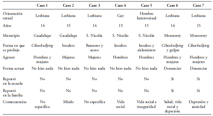 Respecto a los agresores, dos participantes señalan que son hombres, otros dos que son mujeres y tres que son tanto hombres como mujeres. Por otro lado, se observa que solamente dos participantes (ambas mujeres lesbianas de la Secundaria nº 30 de Monterrey) manifiestan que denunciaron los hechos tanto en su familia como en la escuela, mientras que las restantes cinco víctimas indican que no realizaron nada al respecto.