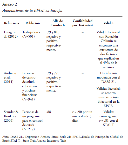 EPGE adaptada en Venezuela. En Sudamérica, Benítez, D Anello y Noel (2012) comenzaron la adaptación de la EPGE en Venezuela. Contaron con una muestra no aleatoria de 867 funcionarios públicos con edades que oscilaban entre los 17 y 33 años. Los instrumentos utilizados fueron la EPGE, LEVENSON (Internalidad), NORMALTA (Ajuste psicológico), NR-21 (Psicológicamente bien consigo misma), el RESI (Resiliencia), ANSILET (Ansiedad) y GEdpr (Depresión). Cabe mencionar que para efectos de está adaptación se invirtieron los ítems negativos a positivos, por lo que a mayor puntaje menor estrés negativo.