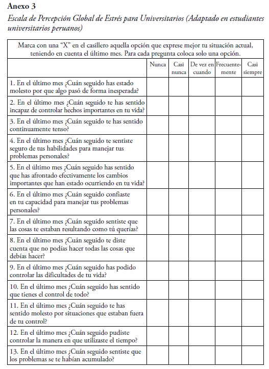 Se utilizó la EPGE adaptada en Chile por Tapia et al. (2007) y la adaptada en México por González y Landero (2007b), ya que, según los jueces expertos en comprensión lingüística, están conformadas por un castellano más acorde al peruano y han sido adaptadas también en estudiantes, motivo por el cual definiría una mejor construcción lingüística de cada ítem. Asimismo, se realizó la doble traducción con la escala original de Cohen et al. (1983) con el propósito de mantener los contenidos originales de la prueba.