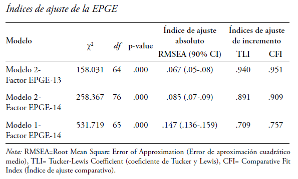 Posteriormente, se procedió a realizar un Análisis Factorial Confirmatorio para examinar los índices de ajuste. Por ello, para efectos del análisis y comparación de los modelos bifactoriales se tomó en cuenta la oblicuidad de los factores, es decir la correlación de ambos factores, utilizando el método de máxima verosimilitud, para la estimación de los parámetros. A partir de este análisis, se encontró que dentro de los modelos bifactoriales de la EPGE, el modelo de 13 ítems fue el que presentó mejores índices de ajuste. Mientras que el modelo de un solo factor no evidenció un índice de ajuste aceptable (ver Tabla 3).