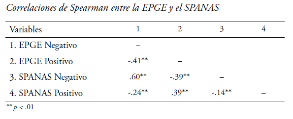 Las evidencias de validez convergente y divergente de las escalas fueron evaluadas a partir de los resultados de las correlaciones entre los factores de eustrés —estrés positivo— y distrés —estrés negativo— de la EPGE con los factores de afecto positivo y afecto negativo del SPANAS (ver Tabla 4).