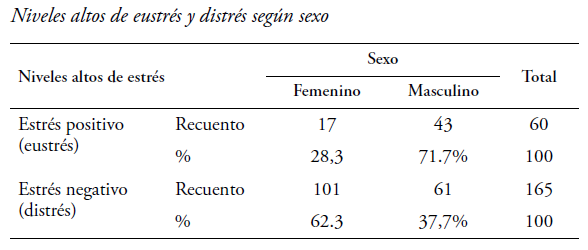 Debido a que el EPGE no tiene un puntaje de corte (Tapia et al., 2007) la obtención de este se calculó estadísticamente en base a los resultados obtenidos en esta investigación. De esta manera se dividieron los puntajes totales de cada dimensión en los siguientes percentiles: el P25 para un nivel bajo, que va desde 0 a 9 puntos en el distrés y de 0 a 17 puntos en el eustrés; el P50 para un nivel Moderado, que va desde un puntaje de 10 hasta 12 para el distrés y de 10 hasta 22 en el eustrés; y un P75 para un nivel alto, que va desde 13 hasta 24 en distrés y de 23 hasta 28 en eustrés. En base a estos parámetros se encontró que el 48.8% (n=162) de la muestra total presenta un nivel alto Estrés Negativo. En contraparte, sobre la base del Estrés Positivo, un 18.1% (n=60) presentan un nivel alto.
