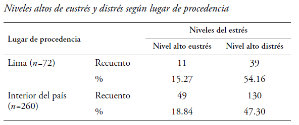 Respecto a los resultados obtenidos en el EPGE y la variable lugar de procedencia, en los niveles de eustrés, no existen diferencias significativas entre los alumnos que provienen de Lima y los que provienen del interior del país, x2 (2)= 2.822, p< .244. Asimismo, dentro de los niveles de distrés, no existen diferencias significativas entre los alumnos que provienen de Lima y los que provienen del interior del país, x2 (2)= 1.063, p< .588. Sin embargo, existe una similitud entre el gran número de alumnos que presentan niveles altos de distrés y el bajo número de alumnos que presentan niveles altos de eustrés (ver Tabla 6).