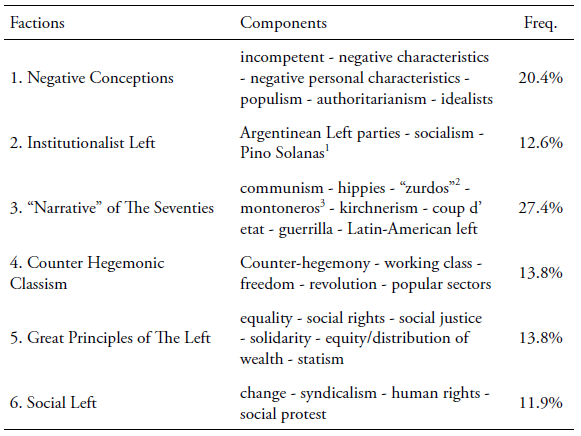 Lastly, we address the ideological importance of Kirchnerism. There are many interpretations regarding the ideology of the current Argentine presidency. Even though we cannot draw firm conclusions based on our data, we do have to point out that neither those who self-position to the left, nor those who generally maintain progressive positioning, identified the category “Kirchnerism” as part of the “left in Argentina”. This category appears in the “narrative of the seventies” node, which was mainly subscribed by rightist or persons with mostly conservative attitudinal positioning.