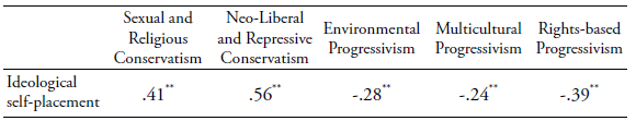 Political ideology: the Political Ideology Scale was constructed based on Brussino, et al´s (2011) proposal. The scale’s items evaluate positions on specific issues (social politics, economy, sexuality, drugs, etc.), taking into account State intervention or lack thereof. Each item was measured on a five-point scale ranging from (1) “do not agree” to (5) “totally agree”. Concerning proof of validity, the internal structure of the scale was analyzed using exploratory factor analysis. The feasibility of the analysis was evaluated with the KMO (Kaiser-MeyerOlkin) measure of sampling adequacy, which presented a value of .843 and the Bartlett test of sphericity, which presented significant results (gl=496; sig=.000). In accordance with Kaiser-Gutman´s rule, a fivefactor structure was observed, explaining 44% of the variance. The first factor corresponding to a scale called Sexual and Religious Conservatism (10 items) explained 12% of the variance; the second factor, called Neo-Liberal and Repressive Conservatism (6 items) explained 10% of the variance, while the third and fourth factors, Environmental Progressivism, and Multicultural Progressivism (6 items each), explained 8% of the variance each. The fifth factor called Rights-based Progressivism (4 items) explained 6% of the variance. The five factors had acceptable reliability values (Sexual and Religious Conservatism α=.83, Neo-Liberal and Repressive Conservatism α=.79, Environmental Progressivism α=.73, Multicultural Progressivism α=.61 and Rights-based Progressivism α=.60).