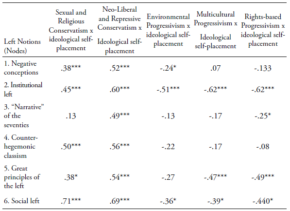 Finally, in Table 3 the five conceptions of “the left in Argentina” are incorporated into the analysis above. That way, the relationships between self-placement and Political Ideology Scale were analyzed again, but this time controlling the relationships by “left in Argentina” nodes. Thus, only people categorized as “node 1” were selected and the relationships between the variables were calculated, then repeating this procedure for people of node 2, and subsequently people of the other nodes.