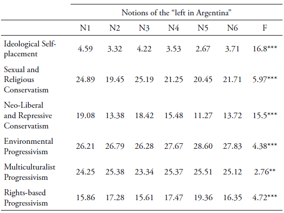 Finally, with regards to Rights-based Progressivism (PI factor 5), significant statistical differences were found between those who perceive the “left in Argentina” based on negative conceptions (N1), and the “narrative” of the seventies (N3), who present lower rights-based progressivism, and citizens whose perspective is based on the great principles of the left (N5) (p<.000), who score highest. No significant differences were found among the other conceptions of the left.
