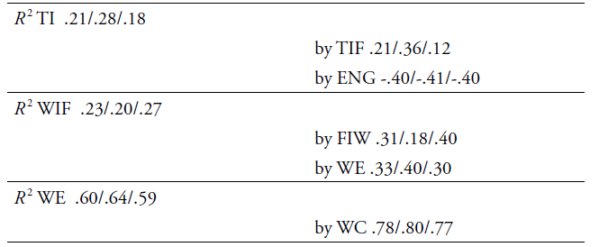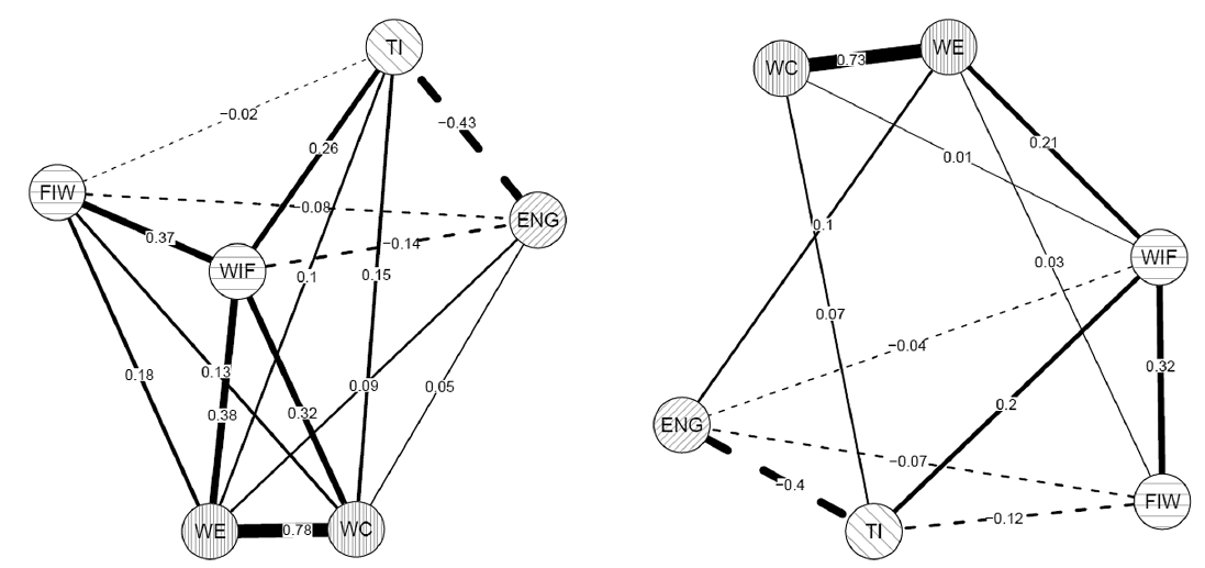 Analysis of the second model of Figure 1 reveals that eliminating spurious correlations (partial correlation network) reduces the strength of relationships between variables. However, the positive relation between WC and WE and between ENG and TI remains strong. Though less intense, relations between WE and WIF and WIF and TI remain. The same occurs between WE and TI. Specifically, among the variables studied, there was a significant and high magnitude correlation between WC and WE (r= .73), WIF and FIW (r= .32), WE and WIF (r=.21), WIF and TI (r= .20). A correlation was also observed between WC and TI (r= .10) and WE and FIW (r= .30). Negative correlations occurred between ENG and TI (r= -.40), FIW and ENG (r= -.07), and FIW and TI (r= -.12).
