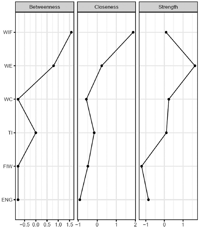Figure 2 shows centrality, that is, the descriptive measures of the roles of the variables (nodes) in the estimated model. Strength indicates the extent to which a node is directly linked to other nodes. Closeness demonstrates how well a node is indirectly linked to other nodes and betweenness shows how important a node is in the path between two other nodes, or the degree to which it serves as a ‘bridge’ between other nodes. The results indicate that the node with the highest betweenness is Work Interference with Family (WIF) and those with the lowest betweenness are work Engagement (ENG) and Family Interference with Work (FIW), for both the correlation and graphical lasso networks. Similarly, the node with the highest closeness is WIF and the lowest ENG. Finally, the nodes with the greatest strength in the correlation and graphical lasso networks, respectively, are WIF and WE, while those with the lowest strength are ENG and FIW.