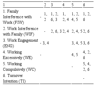 Note: WIF = Work interference with family, WE= Working excessively, WC= Working compulsively, TI= Turnover intention, FIW= Family interference with work, ENG= Engagement.