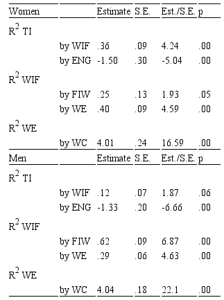 Table 2 shows which variables contributed significantly to model adjustments for the entire group (men and women), as well as the male and female groups, respectively. The term “by” indicates influence and directionality; for example, TI by FIW is how much FIW influences TI. Estimators separated by bars indicate the regression coefficients for the overall group, men, and women, respectively.