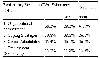 The third block, which explained more variation in the levels of burnout was composed of adaptability and sshowed high predicting values: R2aj = 25.4% for exhaustion, 26.1% for dehumanization and 26.2% for disappointment. Hypothesis 1 was confirmed only for the dimension control, which was a negative and significant predictor of burnout.