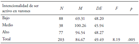 En nuestra investigación, cuando se relacionó la intención de ser activo con la actividad física, se encontraron asociaciones significativas tanto en varones como en mujeres. Aquellos varones que quedaban encuadrados en baja intencionalidad de ser activo, fueron los que arrojaban medias de actividad física inferiores. En cuanto a las mujeres, se observa como la media de minutos de actividad física realizada va creciendo conforme se encuadran en las tres categorías (baja, media, alta), siendo la alta intencionalidad de ser activo la que se asocia con más minutos de actividad física.