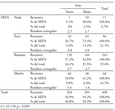 En la Tabla 1 se pueden apreciar los sujetos encuadrados en las cuatro opciones de respuesta en función de las medias obtenidas en la escala de Medida de la Intencionalidad de Ser Activo (MIFA). La prueba de chi cuadrado ha detectado diferencias significativas entre sexos en la intencionalidad de ser activo (.. = 33,118; . < .01) de los sujetos analizados. Un 21% del total de la muestra afirma tener poca