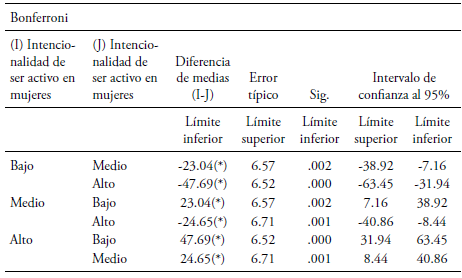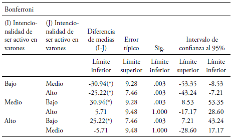 El análisis post hoc (Tabla 5) encontró relaciones entre los niveles bajo y medio (. = .002), bajo y alto (. < .001), y medio y alto (. = .001) de intencionalidad de ser físicamente activo.
