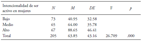 En mujeres (Tabla 4), se observan asociaciones significativas en los 3 niveles de intencionalidad de ser físicamente activo respecto a las medias de minutos de actividad física de los participantes. Se observa como los niveles de actividad física van aumentando conforme sube la intencionalidad de ser activo (. < .001).