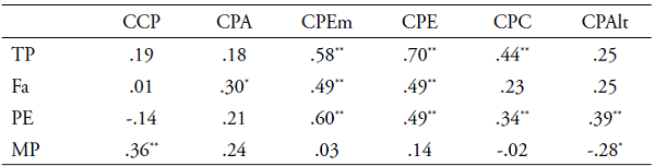 Finalmente, se puede observar que la conducta prosocial pública se correlaciona de manera significativa con el malestar personal (rho = .36; . < .01); la conducta prosocial anónima con la fantasía (rho = .30; . < .05) (tabla 6). La tendencia a ayudar en situaciones de emergencia y la conducta prosocial emocional presentan correlaciones significativas (. < .01) con toma de perspectiva, fantasía y preocupación empática. La conducta prosocial por obediencia o complacencia presenta correlaciones con la preocupación empática (rho = .34; . < .01) y de toma de perspectiva (rho = .44; . < .01). Finalmente, la tendencia altruista se correlaciona con la preocupación empática (rho = .39; . < .01) y el malestar personal (rho = .28; . < .05). En términos generales se evidencian correlaciones fuertes entre las conductas prosociales y la empatía, especialmente con las dimensiones cognitivas (TP; Fa) y la preocupación empática.