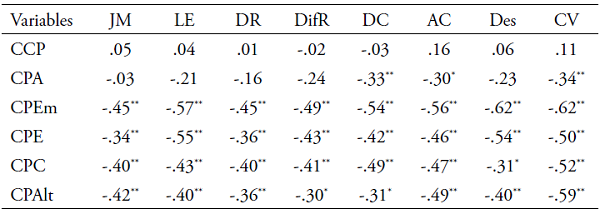 Para verificar si se cumplen los supuestos de normalidad en cada una de las variables, se aplicó la prueba de Kolmogorov-Smirnov y se comprobó que no todas se distribuyen normalmente. Por tanto, se establecieron las correlaciones entre las variables calculando el coeficiente Rho de Spearman. En la Tabla 4 se observan correlaciones significativas (. < .05) de signo negativo entre las diferentes las variables de estudio. En términos generales se puede evidenciar que los diferentes mecanismos de desconexión moral se relacionan de manera negativa con las conductas prosociales. La tendencia prosocial anónima presentó correlaciones negativas fuertes con los mecanismos de distorsión de las consecuencias, atribución de la culpa y comparación ventajosa. Las tendencias prosociales emocional, emergencia, complacencia y altruismo presentaron correlaciones negativas estadísticamente significativas (. < .05) con todos los mecanismos de desconexión moral evaluados.