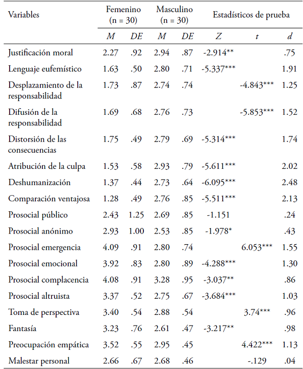 Se hizo el análisis comparativo de los mecanismos de desconexión moral, las dimensiones de la empatía y las tendencias prosociales en función del género (Tabla 3). Dado que no todas las variables presentaron una distribución normal de acuerdo con la prueba de Kolmogorov- Smirnov, se utilizó la Prueba U de Mann-Whitney; y para las variables con distribución normal, la . de student. Se identifica que el género masculino presenta promedios más altos en todos los mecanismos de desconexión moral, y la diferencia es estadísticamente significativa (. < .05). En cuanto a la empatía y las tendencias prosociales, la diferencia es inversa, el género femenino presenta promedios estadísticamente significativos (. < .05) más altos. Se calculó el tamaño del efecto mediante la . de Cohen, la cual arrojó puntuaciones superiores a .5, lo cual evidencia que las diferencias estadísticas encontradas son independientes del tamaño del efecto.