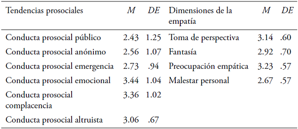 Para el caso de las conductas prosociales (Tabla 2), la tendencia prosocial por obediencia obtuvo el puntaje promedio más alto (. = 3.68; DE = 1.01), seguido de la tendencia prosocial emergencia (. = 3.44; DE = 1.04). Estos datos indican que la tendencia a ayudar a una persona por complacer y obedecer a los demás o en una situación de riesgo vital es mucho mayor a las conductas de ayuda mediadas por motivaciones altruistas o emocionales. Las medidas muestran que hay una menor tendencia a la ayuda en contextos públicos o que involucra presencia de muchas personas. En cuanto a la empatía, el mayor valor promedio se obtuvo en la dimensión de preocupación empática (. = 3.23; DE = .57); sin embargo, el malestar personal obtuvo el pun- taje más bajo (. = 2.67; DE = .57).