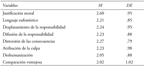 En la Tabla 1 se presentan los resultados descriptivos de los diferentes mecanismos de desconexión moral en los adolescentes estudiados, evidenciando que la dimensión que alcanza mayor valoración media es la de justificación moral (. = 2.60; DE = .95), lo cual indica que las acciones consideradas incorrectas por la sociedad, o que generan algún daño a los demás, se justifican a nivel cognitivo como un medio para lograr un fin moralmente correcto. El mecanismo que presenta la menor medida es la comparación ventajosa (M = 2.02; DE = 1.02).