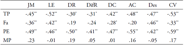 En cuanto a la desconexión moral y su relación con la empatía (Tabla 5) se identificaron correlaciones negativas estadísticamente significativas (. < .01) entre la toma de perspectiva y la preocupación empática con los diferentes mecanismos de desconexión moral. La dimensión de fantasía se correlaciona negativamente con la justificación moral (rho = -.36), lenguaje eufemístico (rho = -.42), distorsión de las consecuencias (rho = -.28), deshumanización (rho = -.46) y compa- ración ventajosa (rho = -.33). La dimensión de malestar personal no muestra correlaciones significativas.