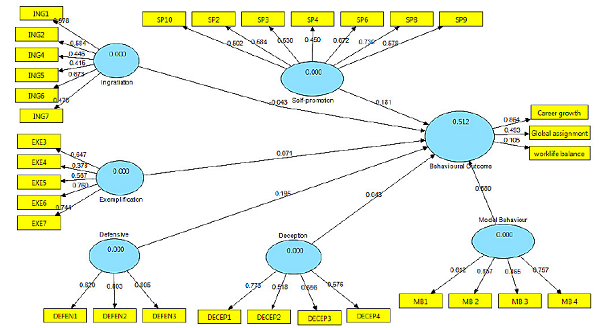 The R square value of the dependent factor viz. factors of impression management impacted the individual behavioural outcome of employees (.512). The results validated the effect, and the inner model suggests the possible relationship between, Model behaviour developed by the indi- vidual and the behavioural outcome is 58.0%. Self-promotion strategies developed by the individual and the resultant behavioural outcome are 18.1%. Defensive strategies developed by the individual and the behav- ioural outcome are 19.8%. Exemplification strategies developed by individual employees will impact the behavioural outcome by 7.1%.