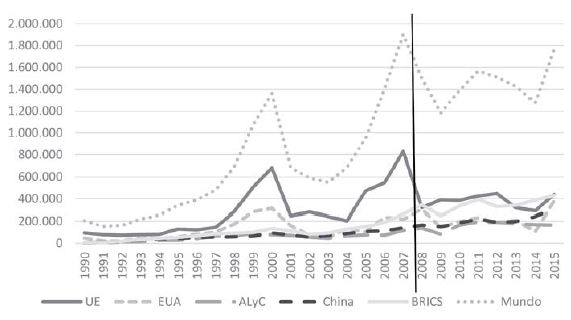 No obstante, esta tesitura no logró vivificar el proceso inversor, que aún se mantiene a niveles de la crisis. Como parámetro de comparación, en el desplome previo, al inicio del siglo, en 5 años se había logrado la recuperación. La UE, bajo la crisis descrita, ha sido particularmente afectada, perdiendo gravitación en el total. Aun así -como queda de manifiesto en el Gráfico 1-, explica cerca de la mitad de la inversión extranjera directa (IED) junto con EUA. Sin embargo, en ambos casos, esta inversión procede de masivas fusiones y adquisiciones que, sin crear capacidad productiva, fomenta mayores niveles de centralización de la propiedad. El grupo de países que más peso ganó son los BRlCS, que en 2015 ya eran origen del 15% y destino del 25% de la lED total. Este aumento responde básicamente a China.