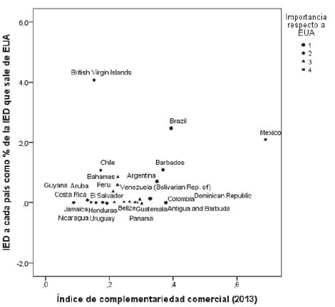 Para ver estos impactos, analizamos dos indicadores (Cantamutto y Costantino, 2017). Por un lado, un índice de complementariedad comercial, que compara la estructura de las importaciones de EUA respecto de las canastas de exportación de cada país. Por otro lado, la participación de cada país en la IED de EUA en la región (que es cerca de un 9%). Con base en ambos indicadores, agrupamos los países en 4 grupos.5 Asumimos que las reformas que se propone implementar Trump en EUA podrían alterar los vínculos al exterior por estas dos vías, comercial e inversora. Las menores importaciones disminuirían la demanda de bienes en la región, y el uso de recursos para invertir en aquel país los retraería de colocaciones foráneas.