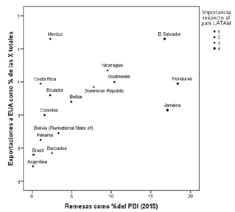 Se observa que las economías de mayor tamaño relativo -Argentina y Brasil- no dependen en gran medida del comercio con EUA ni las remesas son fuente relevante de recursos. El impacto sobre estos países no sería tan directo. La otra economía más grande de la región, México, tiene una situación diferente. Debido al TLCAN, México está sumamente integrado a EUA, cuya demanda marca de manera tajante sus exportaciones. Las remesas, aunque relevantes debido a la intensidad de la migración transfronteriza, son relativamente bajas respecto de su PBI total. En cambio, se puede constatar lo que sugeríamos con el análisis previo: que las pequeñas economías de América Central y el Caribe serían afectadas por ambas vías. Éstas suelen especializarse en gran medida en ventas de pocos productos o servicios a EUA, país donde suelen arribar grandes contingentes de migrantes -que luego remiten dólares a sus familias-.