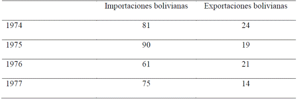 El último informe disponible sobre el libre tránsito boliviano durante el régimen militar data de 1977. Se trata de una separata del MINREL denominada “Facilidades de Libre Tránsito que Chile otorga a Bolivia”. Las cifras que entrega el documento dan cuenta de la capacidad portuaria chilena y de la asimetría efectiva del comercio de Bolivia. Al respecto, cabe consignar que “el marcado desequilibrio” era causante ya en 1977 de “un serio problema económico al ferrocarril, ya que una gran proporción de los carros que llevan mercadería a La Paz deben regresar vacíos” (MINREL, 1977, p.12). En este esquema, el diagnóstico chileno era que “el Estado chileno otorga subsidio al comercio exterior boliviano” y que producto de años en estas circunstancias, desde 1959 hasta 1977, se había acumulado una deuda de U$ 3.556.000 (MINREL, 1977, p.19).