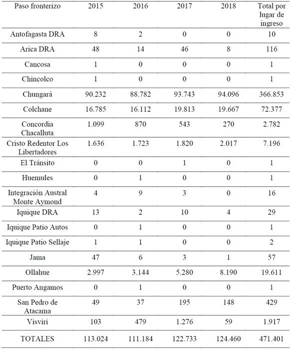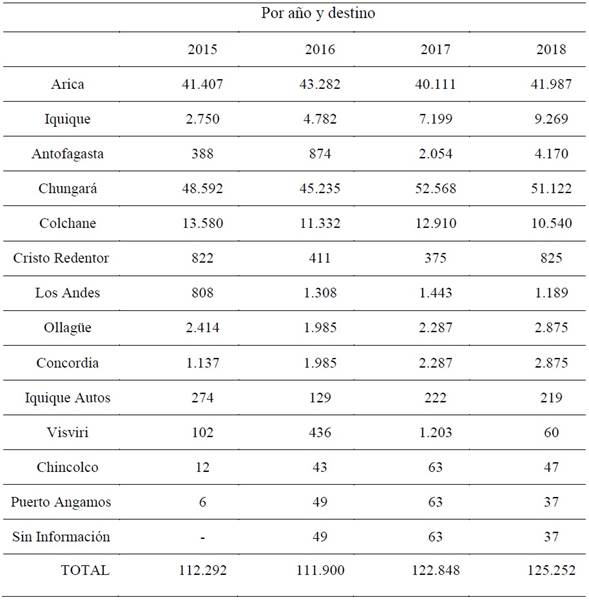 Ya se ha hablado cómo era en fases del siglo XX. La acumulación de evidencia determina que, entre 2015-2018, Bolivia ha logrado instalar 471.401 camiones en la frontera con Chile, a razón de 115 mil por año. Esto implica que las distancias desde los centros de carga boliviana prefieren puertos chilenos que peruanos y que, nuevamente, el problema no es tampoco la infraestructura, sino la distancia. La encuesta citada por Agramont y Peres Cajías (2016) no discrimina si la insatisfacción del comercio internacional es porque la infraestructura chilena o boliviana es deficiente. Sin embargo, lo que sí es posible determinar es que la carga llega a puerto. La Tabla N° 3 lo precisa por paso fronterizo y la Tabla N° 4, por puerto de destino.