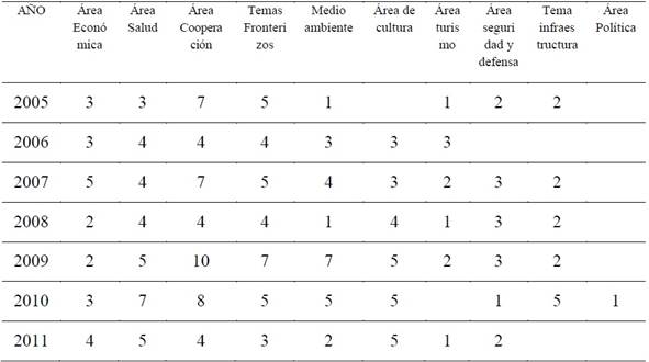 2005-2011. Momento en el cual se reunieron periódicamente comisiones sobre libre tránsito entre ambos Estados. El tema del libre tránsito fue uno de entre 10 áreas temáticas dispuestas.7 En aquellas donde pudieron haberse manifestado reclamos, como es la económica, no se aprecia mayor complejidad. Sin embargo, sí es importante destacar la cooperación en ámbitos como seguridad y defensa y el fortalecimiento comercial fronterizo. Esas reuniones para negociar y establecer acuerdos se suspendieron a partir 2011, cuando emergió la reivindicación marítima y la demanda ante la Corte Internacional de Justicia de la Haya. Ver Tabla N° 5.