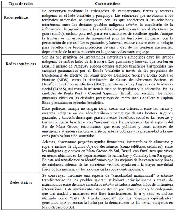 Además, los pueblos indígenas construyen redes a través de sus territorialidades alternativas y de resistencia, que implican la vinculación de múltiples territorios articulados (zonales). Para los guaraníes y los kaiowá, esta articulación en múltiples redes implica un grado de movilidad física a ambos lados de la frontera internacional, tal como se sistematiza a continuación en el Cuadro N° 1.