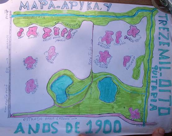 La lucha por los territorios indígenas es un proyecto de continuidad de la vida, de otorgar un futuro para los pueblos indígenas. De ahí la importancia de la memoria y la reorganización de la memoria colectiva de los pueblos indígenas -memorias de las expulsiones y remociones forzadas de los territorios tradicionales- en el rediseño de esta territorialidad en la época contemporánea. Estos pueblos están reelaborando su territorialidad a partir de las memorias colectivas de sus antepasados y ante la desterritorialización/expulsiones que sufren. De ahí que las luchas que sostienen buscan reconfigurar las actuales demandas de demarcación de tierras ancestrales en las acciones colectivas de recuperación del tekoha. En esta reelaboración de la memoria, los guaraníes y los kaiowá dibujan mapas mediante cartografías nativas de su tekoha, representando así cómo eran, antes de territorializar el agronegocio, los caminos; sus áreas colectivas de bosque, agricultura, pesca, recolección; los ríos; la casa del rezador (Ñhanderu); los lugares sagrados; el cementerio; las casas de parientes de la misma familia, entre otros lugares. En la Figura N° 1 es posible observar un mapa elaborado por los propios indígenas en situación de campamento de recuperación, que representa los Tekoha Apyka'i, en Dourados, Mato Grosso do Sul, un territorio tradicional reivindicado. Esta cartografía autóctona permite reconstruir referencias espaciales y temporales a través de la memoria colectiva e individual, de manera de revivir la territorialidad ancestral y devolver la demarcación original de los tekoha.