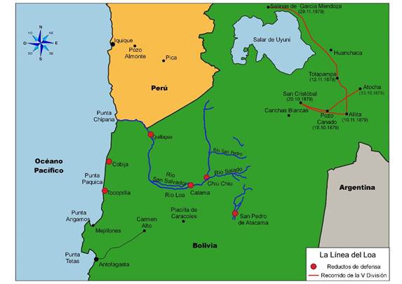La campaña por el control del Departamento Litoral se completó con la ocupación de las restantes localidades hasta entonces bolivianas. Entre ellas las más importantes fueron San Pedro de Atacama (100 km al sureste de Calama) y San Francisco de Chiu Chiu (35 km al nordeste de Calama). La localidad de Chiu Chiu estaba ya a 215 km al sudeste de Canchas Blancas. Con el control y ocupación militar de estas localidades, el ejército de Chile formó la llamada “Línea del Loa”, que tenía como objetivo asegurar el dominio chileno en el antiguo Departamento del Litoral de Bolivia (Bulnes, 1911, p. 179). Para los militares chilenos, la Línea del Loa estaba “destinada a impedir que el ejército boliviano bajara hacia el Litoral, concretamente en dirección a Antofagasta” (Gutiérrez et al., 1981 p. 75).