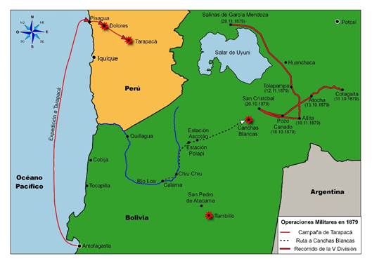 Mientras tanto, en el departamento de Antofagasta, las fuerzas chilenas realizaban movimientos para consolidar sus posiciones. Las tropas asentadas en Calama efectuaron incursiones hacia el interior, siguiendo la ruta de las antiguas postas del camino que comunicaba con Huanchaca y Potosí, con el objeto de interceptar el tráfico de abastecimiento de los ejércitos boliviano y peruano, y de infundir temor en la población local (Sanhueza y Gundermann, 2009). Una de estas excursiones se extendió, justamente, hasta Canchas Blancas el 4 de setiembre de 1879: