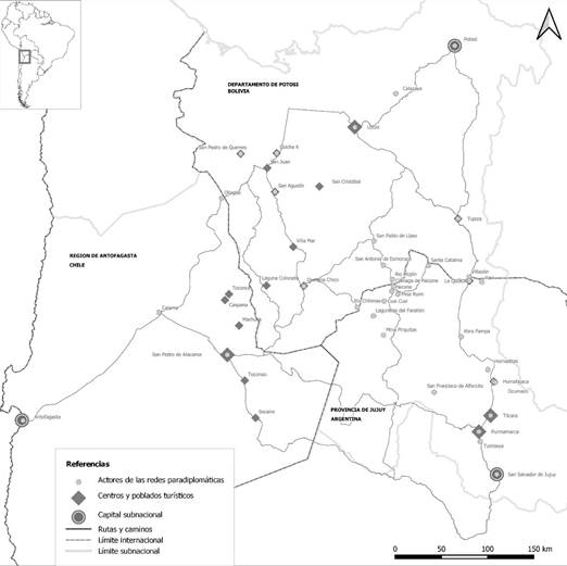 A partir del análisis de las iniciativas de integración turística fue posible reconstruir las redes paradiplomáticas que pusieron en diálogo a diferentes localidades, a partir de la agencia de múltiples actores situados a cada lado del límite interestatal. En la Figura 1 se muestran las localidades que han conformado las diferentes redes, así como los principales centros y poblados turísticos de la Circumpuna.