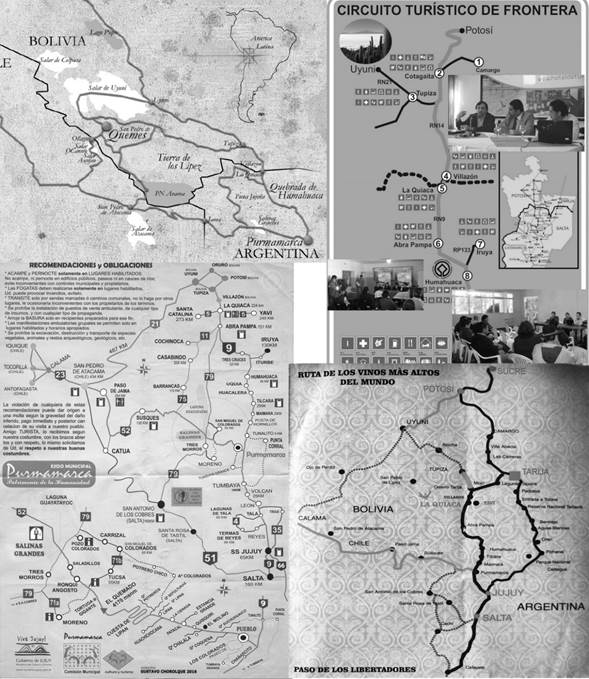 Las cartografías de la integración turística son proyecciones que tienen la finalidad de crear una imagen ideal o idealizada de las relaciones espaciales y fronterizas de la Circumpuna, vehiculizando, a su vez, acciones que materialicen las representaciones creadas. A diferencia de las cartografías oficiales (que generalmente recortan la figura de un país singularizado, mientras que los vecinos son representados con una superficie blanca como un espacio vacío), estos mapas enfatizan en las continuidades a cada lado del límite interestatal.
