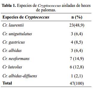En ninguna de las muestras cloacales se aisló Cryptococcus. En 47/300 muestras de heces secas y frescas se aisló Cryptococcussp (tabla 1). Siete (14,9%) aislados correspondieron a Cryptococcus neoformans y todos de la variedad neoformans.