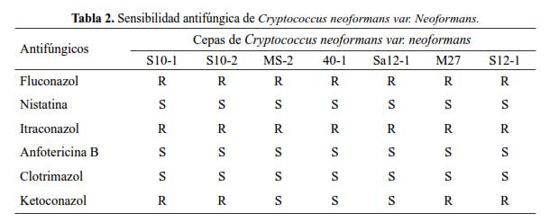 Con respecto a la sensibilidad antifúngica, las 7 cepas de Cryptococcus neoformans var. neoformans fueron sensibles a nistatina, anfotericina B y clotrimazol,y resistentes al itraconazol y fluconazol (tabla 2).