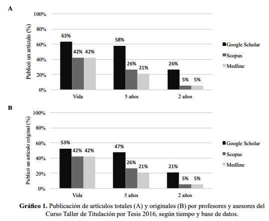 Abstract: Objectives: To determine the frequency of publication of scientific articles by thesis advisors of the School of Medicine of a private University in Lima, Peru. Methods: Cross-sectional and descriptive study. We search for papers using Google Scholar, Medline, and Scopus. The frequencies and percentages of the variables were calculated. Results: Out of 19 advisors, 63% of them had ever published an article in their life, and 53% had ever published an original article. 26% and 21% have published an original paper in Scopus and Medline in the last five years, respectively; while only 5% published an original article during the previous two years in those databases. Just one teacher (5.3%) was registered in REGINA. Conclusions: The publication rate in recent years of the thesis advisers of a School of Medicine of a private University of Lima is poor.