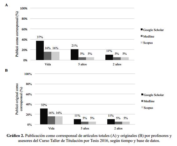El 63% (12/19) de los asesores habían publicado alguna vez en su vida algún artículo (artículo original, reporte de caso, carta al editor, revisión, editorial, etc) y 10/19 (53%) publicó alguna vez un artículo original, a través de la búsqueda con el motor de búsqueda Google Scholar (Gráfico 1A y B). Por otro lado, el 16% de los asesores había publicado un artículo original como corresponsal en Scopus y Medline alguna vez en su vida. Además, sólo el 5% publicó al menos un artículo original como corresponsal en los últimos 2 años (Gráfico 2A y B).