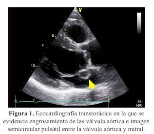 El electrocardiograma inicial mostró taquicardia sinusal e hipertrofia ventricular izquierda (Cornell positivo). En la ETT inicial se observó una válvula aórtica bicúspide con valvas engrosadas con múltiples imágenes nodulares sugerentes de vegetaciones, estenosis y regurgitación moderada de válvula aórtica, regurgitación mitral leve con función sistólica y motilidad de ventrículo izquierdo conservados. Se evidenció imagen sospechosa de extensión perivalvular (Figura 1).