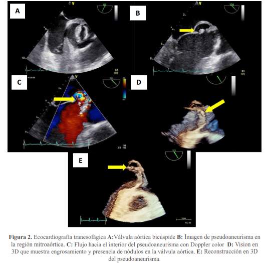 En la ETE se evidenció hipertrofia significativa del ventrículo izquierdo, válvula aórtica bicúspide con valvas engrosadas con múltiples imágenes nodulares compatibles con vegetaciones, la más grande de 6mm, apertura disminuida, perforación de la valva derecha y prolapso del seno de valsalva correspondiente asociada a regurgitación y estenosis valvular moderada. Se halló una imagen semicircular anecogénica en zona mitroaórtica con paredes ecogénicas, de 2,2 cm de base y 1 cm de diámetro transversal con pared de 2 mm con flujo color en su interior. El resto de las válvulas no tenían alteraciones. La conclusión fue endocarditis de válvula aórtica bicúspide con estenosis e insuficiencia moderadas complicada con pseudoaneurisma de la unión mitroaórtica, hipertrofia significativa de ventrículo izquierdo con función sistólica y motilidad de ventrículo izquierdo conservadas (Figura 2).