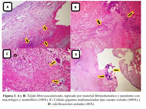 El paciente fue sometido a cirugía para recambio de válvula aórtica con prótesis mecánica, 5 días después en su día 28 de hospitalización. Se evidenció engrosamiento valvar por endocarditis y absceso subaortico de 2,5 cm que perforaba el septum interventricular. Se colocó parche pericárdico en septum interventricular. La anatomía patológica mostró tejido fibrovascularizado, tapizado por material fibrinohemático y purulento con presencia de células gigantes multinucleadas tipo cuerpo extraño y calcificaciones aisladas (Figura 3).